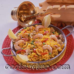 Lavar las almejas en agua fría con sal; abrirlas en un cazo con 1/2 taza de agua, colar y reservar las almejas y el caldo por separado. Lavar los pimientos, quitarles las semillas y trocearlos. Lavar el pollo y trocearlo. Lavar los calamares y cortarlos en tiritas. Pelar las gambas y cocer las cáscaras y las cabezas durante 10 minutos; colar y reservar el caldo.Calentar el aceite en una paella y freír el pollo hasta que se dore; agregar los calamares, saltear un par de minutos y añadir la cebolla muy picada, los pimientos, los guisantes y los tomates pelados. Rehogar todo durante 15 minutos. Incorporar el arroz, revolver y regar con el caldo caliente de las gambas y almejas (más agua), calculando el doble volumen que el del arroz.